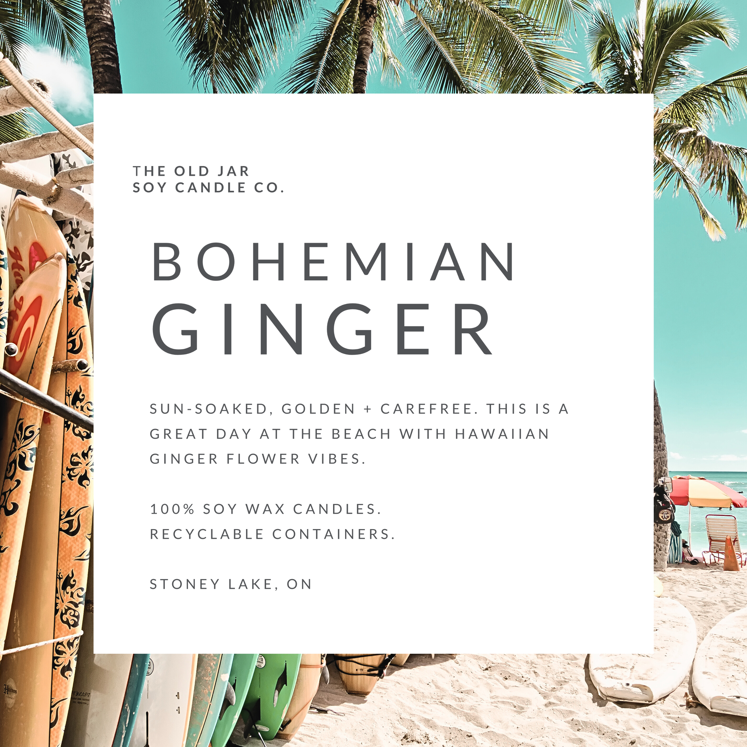 The Bohemian Ginger soy candles blends the sea breeze, with ginger flowers, soft musk and a dash of sweet sunshine. This aromatherapy experience is meant to transport you to a Hawaiian beach on the perfect day. Take it home, light it up, and enjoy our lovely, beachy candle scent that will burn 100% clean.
